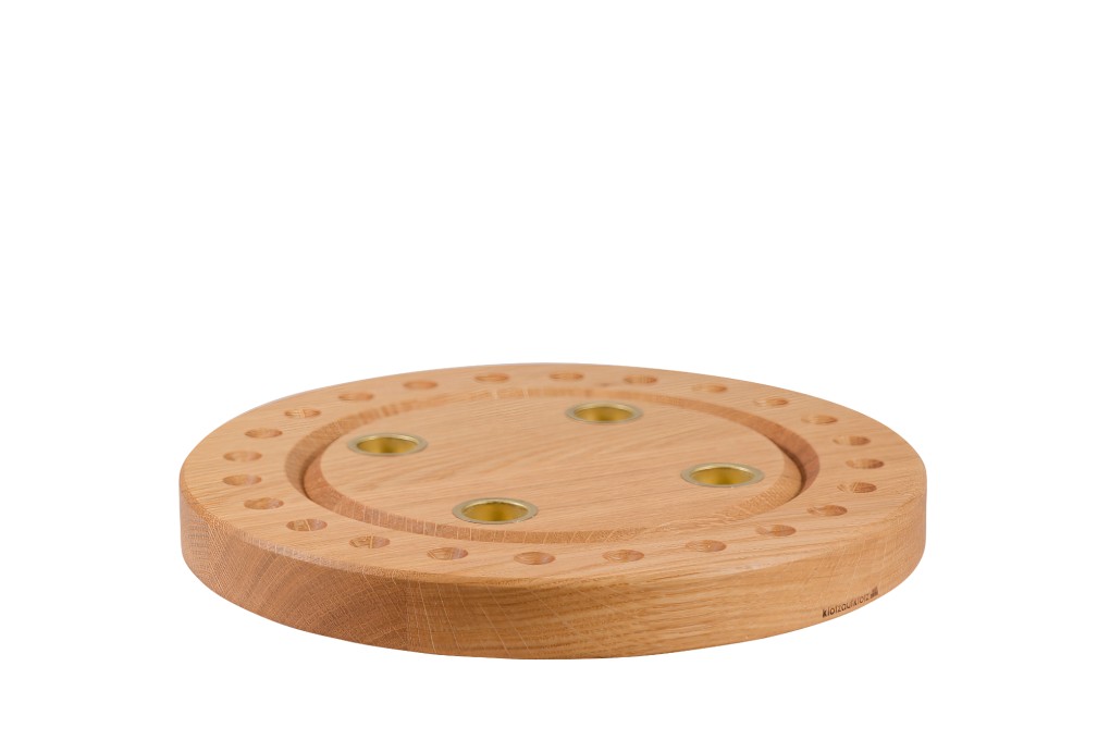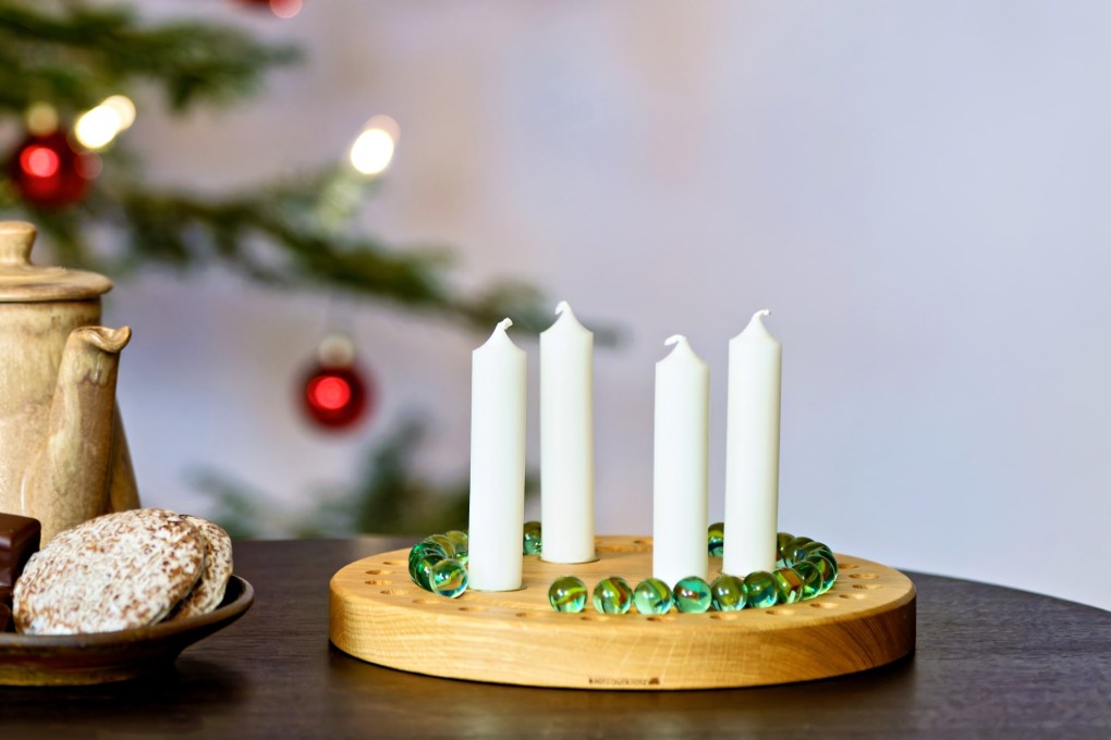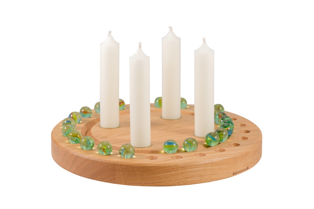 Den Adventskranz fertigt Mathias in der Werkstatt aus massivem Eichenholz. Mittig sind darauf vier Kerzentüllen bzw. Vertiefungen für Teelichtgläser verteilt - denn wählen kannst Du den Adventskranz mit Baumkerzen, Teelichtern oder Stabkerzen. Um die Kerzen herum verläuft eine eingefräste Rille, in der die 24 Murmeln zu Beginn gelegt werden. Ab dem ersten Dezember wird dann täglich eine der Murmeln aus der Rille herausgenommen und in eine der am Rand eingebohrten Mulden gelegt. So wächst die Vorfreude aufs Weihnachtsfest auch ohne Schokolade im Adventskalender. Brennt die vierte Kerze und ist die letzte Murmel in ihrer Mulde, dann ist Heilig Abend da.